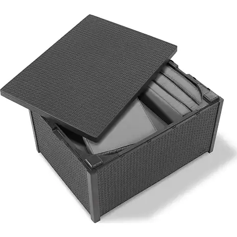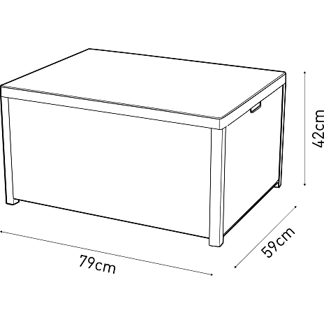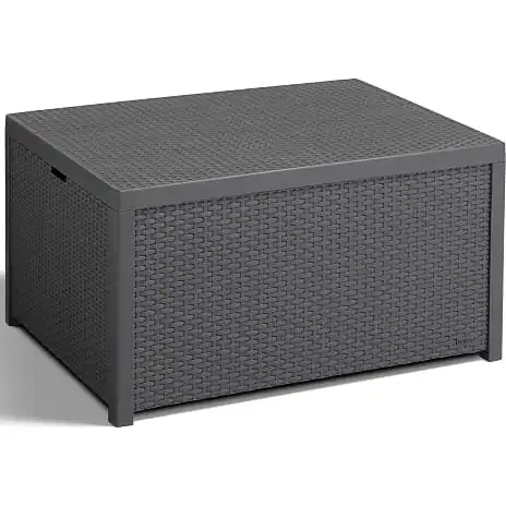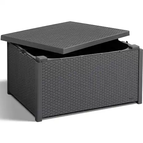 Kombineret hyndeboks og bord, som er fremstillet i formstøbt, gråt plast, og som er ideelt til opbevaring af småting eller dine havehynder.