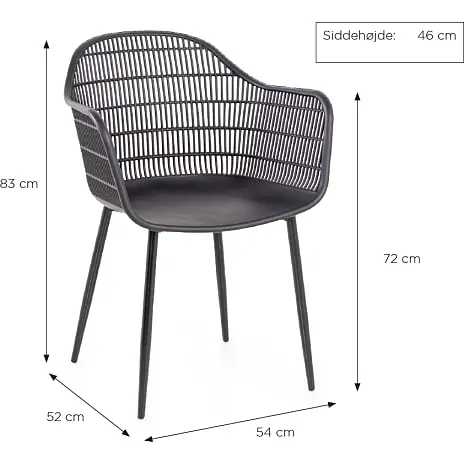Mål: Højde fra jord til armlæn: 73 cm x B: 60,5 cm x D: 58,5 cm