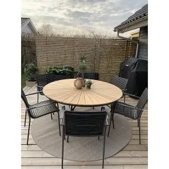 Et udendørstæppe er med til at skabe en hyggelig stemning på terrassen, og det kan enten bruges under havemøbelsættet eller under et loungesæt.