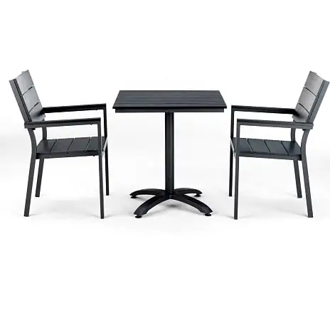 Cafésæt bestående af 1 bord samt 2 stole. Carlton cafébordet har et stel i sort pulverlakeret aluminium og en bordplade i sort nonwood. Carlton stolene er lavet i de samme materialer og er stabelbare. Carlton cafésættet passer perfekt til den lille terrasse, rækkehuset eller til en altan. Materialet nonwood er nemt at vedligeholde, så hvis man foretrækker et minimum af vedligeholdelse, så er dette sæt det helt rigtige. Mål: Bord: B: 70 x L: 70 x H: 72 cm. Stol: B: 47 x D:42 x H: 43 cm. Maks belastning 120 kg. Nonwood: