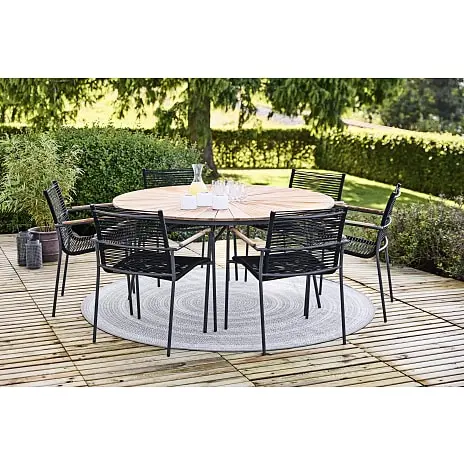 Klassisk havebord med tråd til gamle dage i praktisk aluminiumstel med smukt arrangerede lameller i massiv teak. Et romantisk bord, der aldrig går af mode, og som passer perfekt til både have og terrasse. Her kan du samle hele familien om kaffen eller frokosten under den blå himmel. Bordet har et enkelt og let udtryk, men er særdeles stabilt.