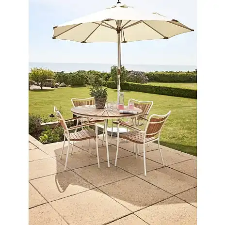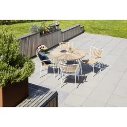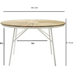 Elegant rundt havebord i moderne retro design, med lakeret stel i hvid og lamelbordplade i teak. Perfekt til dig, der elsker træ i lækker kvalitet, som ikke kræver den store vedligeholdelse.