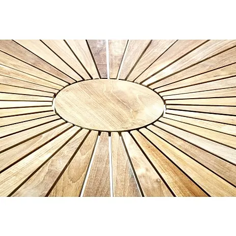 Bordpladen er lagt i et smukt solmønster, og med det slidstærke stel i rustfrit, lakeret aluminium får Kerteminde Teak-bordet et klassisk, eksklusivt look. Et smukt bord til dig, der ønsker rene linjer og plads til 6 siddende gæster i haven eller på terrassen.