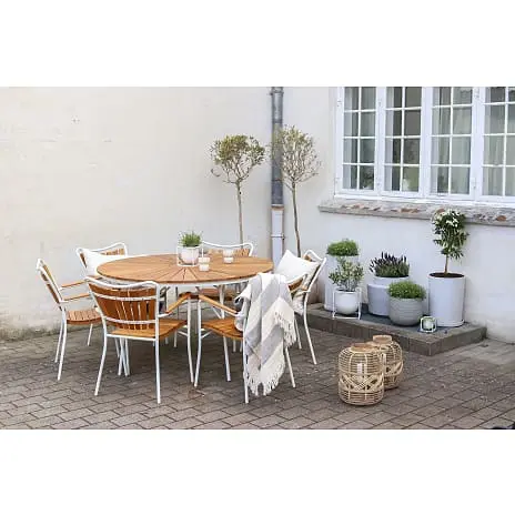 Elegant rundt havebord i moderne retro design, med lakeret stel i hvid og lamelbordplade i teak. Perfekt til dig, der elsker træ i lækker kvalitet, som ikke kræver den store vedligeholdelse.