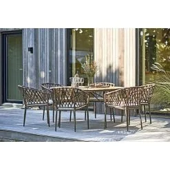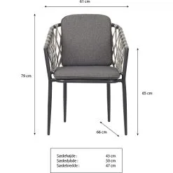 Moderne og smuk rope havestol i vedligeholdelsesfrit materiale. Til dig der er på udkig efter en moderne stol, som kan gøre selv det mest kedelige bord flot. Med formen på stolen, de rundede armlæn og de medfølgende hynder, gives der en formidabel siddekomfort. I denne stol kan du sidde i lang tid under solens stråler med familie eller venner. Vi anbefaler, at hynderne opbevares tørt, når de ikke er i brug.
