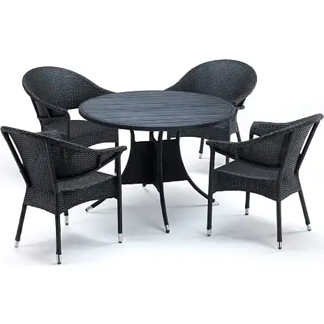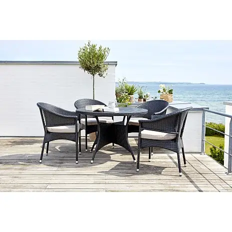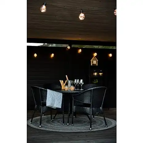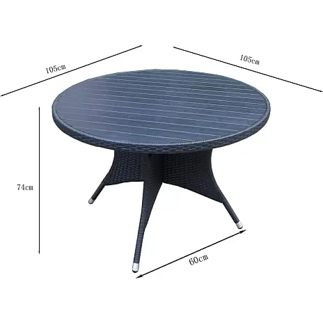 Havebordet har en bordplade i nonwood med en diameter på 105 cm og et stel i sort polyrattan.