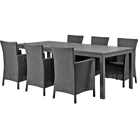 Dette sæt består af et udtræksbord med stel i pulverlakeret, sort aluminium og bordplade i sort nonwood samt 6 stole i formstøbt plast.
