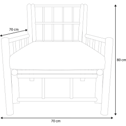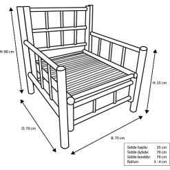 Denne stol, der leveres med hynde med hvidt betræk i 70% bomuld /30% polyester, vil du helt sikkert komme til at bruge hele sommeren – enten placeret på din yndlingsplads i haven eller ved havebordet – og der er basis for at høre nogle gode historier undervejs eller mulighed for at læse en god bog, hvis du foretrækker det. Bemærk at bambusmøbler ikke tåler at stå ude hele året og skal endvidere stå overdækket ved konstant regn. Uden for sæsonen anbefales det, at bambusmøblerne placeres i udestue eller i garage, da bambusmaterialet er følsomt overfor store temperatursvingninger.