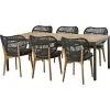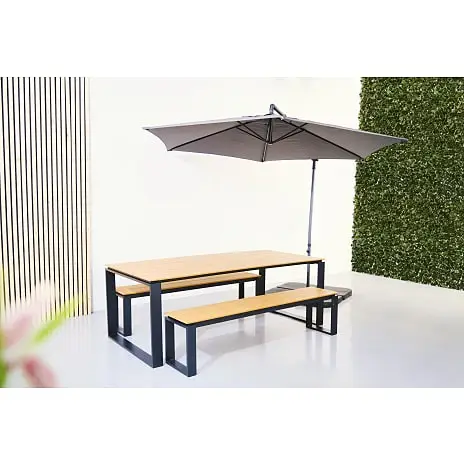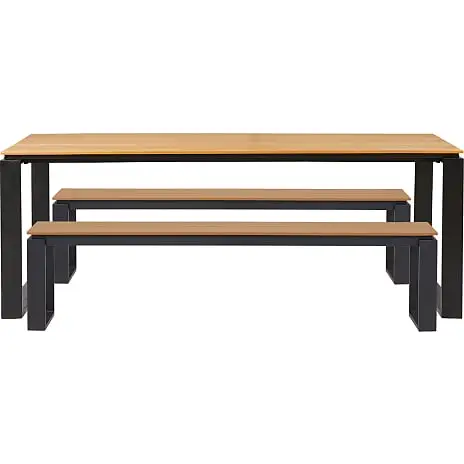 De moderne og stilrene teak-look Melville bænke fuldender dette sæt og indbyder til hyggelige stunder under solens stråler. De flotte overflader og det simple design gør at de passer til enhver terrasse og have.