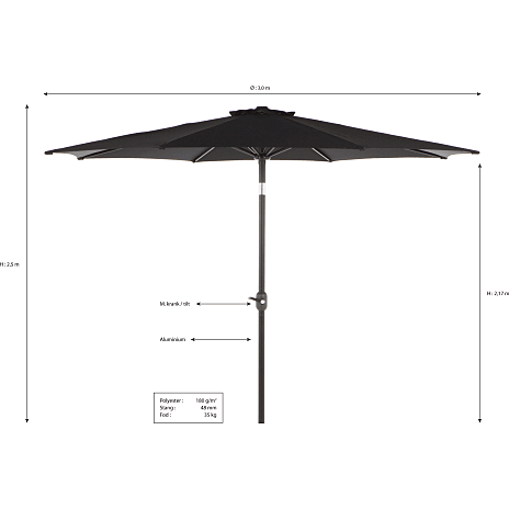 Miami parasollen er stor med sine 3 meter i diameter, derudover har den en krank og tiltbar top. Parasollen passer til enhver terrasse, og giver masser af læ for solen. Dugen er lavet i 180g/m^2 sort polyester.