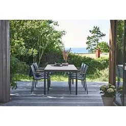 De skifer grå stole passer til til det rektangulære bord, både armlænet i Teak træ og stolebenene i skifer grå matcher Mood Classic havebordet.