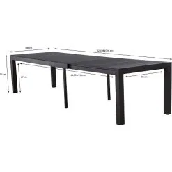 Bordet er 226 x 100 cm, højde 76 cm, og kan trækkes ud til at blive enten 280 eller 343 cm langt, og derved ideelt til at have mange gæster på besøg. Bordet er lavet med et stel i pulverlakeret, sort aluminium og bordplade i sort nonwood.
