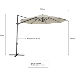 Hængeparasol på Ø: 3 meter, med fod. Dug i polyester 180g/m2. Krank og 360 graders drejesystem.