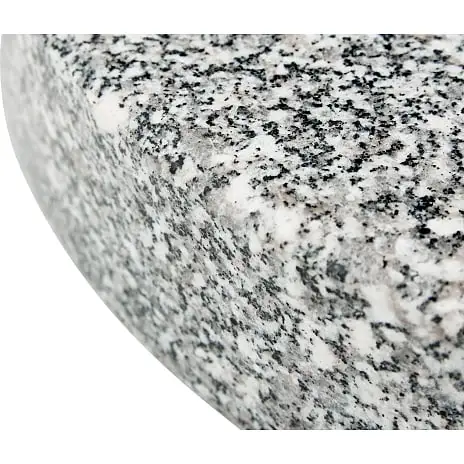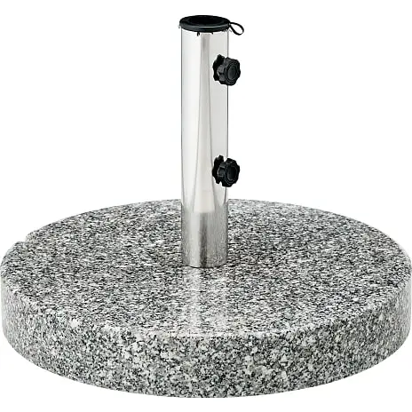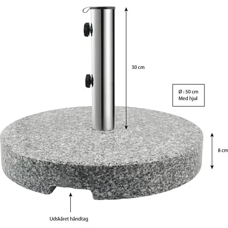 Rund parasolfod i grå granit med hjul og udskåret håndtag.