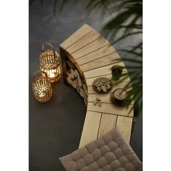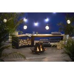 Buet bænk i sort pulverlakeret stål med sæde af fyrretræ og med plads til brænde under sæde.