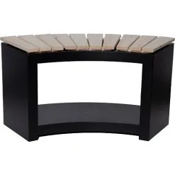 Buet bænk i sort pulverlakeret stål med sæde af fyrretræ og med plads til brænde under sæde.