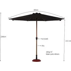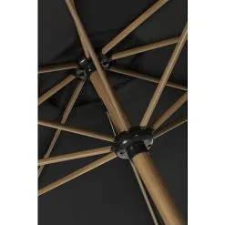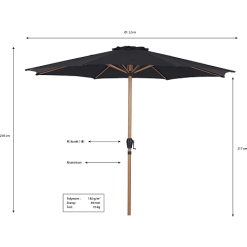 Det lette aluminiumsstel gør parasollen nemmere at flytte rundt på. Parasollen kan nemt åbnes og lukkes ved blot at dreje på stangen. Denne parasol vil pynte på enhver terrasse i dens flotte teak look og sorte 180 g/m^2 polyester dug . Selv om aftenen kan man bruge parasollen i hyggeligt samvær og samtidigt holde varmen ved at sidde fri af aftenduggen.