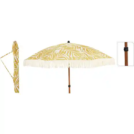Praktisk strandparasol i gul. Parasollen har en diameter på 180 cm. Strandparasollens skærm er lavet i 180 gr. polyester. Stangen er lavet i 22-25 mm metalrør.