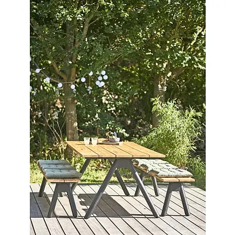 Yuma havebænk er lavet i akacietræ med et stel af pulverlakeret stål.