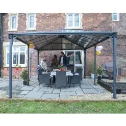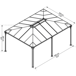 Pavillonen har en holdbar aluminiumskonstruktion og 6 mm dobbeltlagspolycarbonatplader, som beskytter havemøblerne mod UV-stråler, hagl og sne.