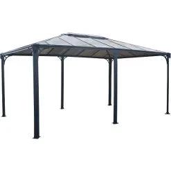 Pavillonen har en holdbar aluminiumskonstruktion og 6 mm dobbeltlagspolycarbonatplader, som beskytter havemøblerne mod UV-stråler, hagl og sne.