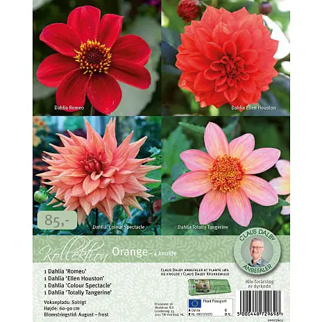 Claus Dalby kollektionen Orange indeholder 4 forskellige dahlia blomsterløg: Romeo, Ellen Houston, Colour Spectacle og Totally Tangerine.