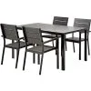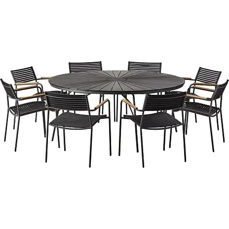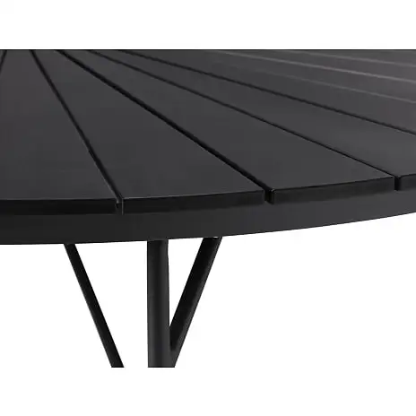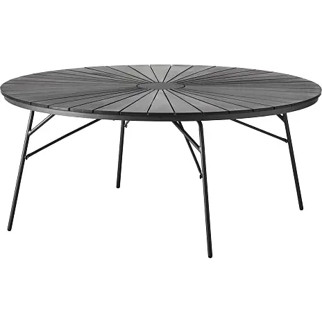 Smukt, klassisk rundt havebord til dig der elsker træ, men ikke vil bruge tid på vedligeholdelse. Bordets retro design har antracirgrå stel og en nonwood lamelbordplade i sort. Bordpladen er lagt i et smukt solmønster, og med det slidstærke stel i rustfrit, pulverlakeret aluminium får Kerteminde nonwod-bordet har et klassisk, eksklusivt look. Et smukt bord til dig, der ønsker rene linjer.