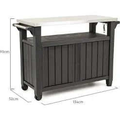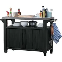 Bordet giver masser af muligheder for opbevaring og har to hjul som gør det nemt at flytte. Bordet er oplagt at have ved siden af grillen til tilberedning og til at sætte af på.