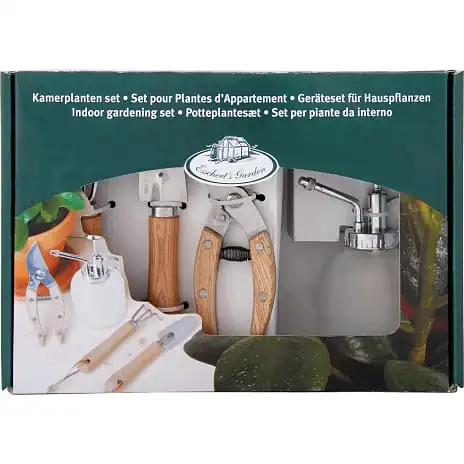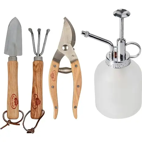 Sæt bestående af sprayflaske, spade, kultivator og beskærersaks.